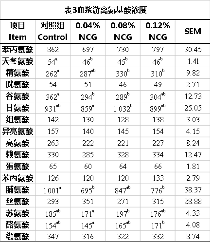 NCG對(duì)母豬血漿氨基酸濃度的影響見(jiàn)表3。0.08% 和 0.12% NCG組顯著提高了血漿精氨酸濃度(P<0.05)。添加NCG的各組均顯著降低了天冬氨酸(Asp)的濃度(P<0.05),0.04% 和 0.08% NCG組相對(duì)于對(duì)照組都降低了谷氨酸(Glu)的濃度(P<0.05)。0.04% 和 0.12% NCG組相對(duì)于對(duì)照組顯著降低了脯氨酸(Pro)的濃度(P<0.05)。